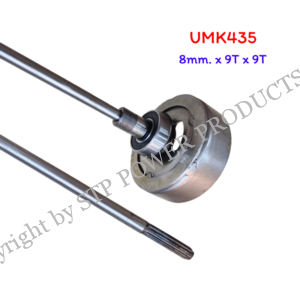 แกนเพลาตัดหญ้าขนาด 8mm. ปลายด้านหนึ่งเป็นเฟือง 9 ฟัน มาพร้อมถ้วยครัชรุ่นหัวผ่าและข้อต่อเพลา ความยาวโดยรวม 143.6cm.