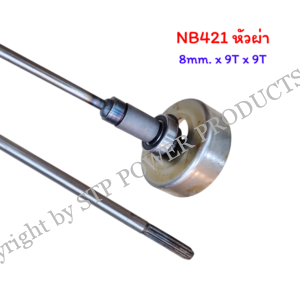 แกนเพลาตัดหญ้าขนาด 8mm. ปลายด้านหนึ่งเป็นเฟือง 9 ฟัน มาพร้อมถ้วยครัชรุ่นหัวผ่าและข้อต่อเพลา ความยาวโดยรวม 143.6cm.
